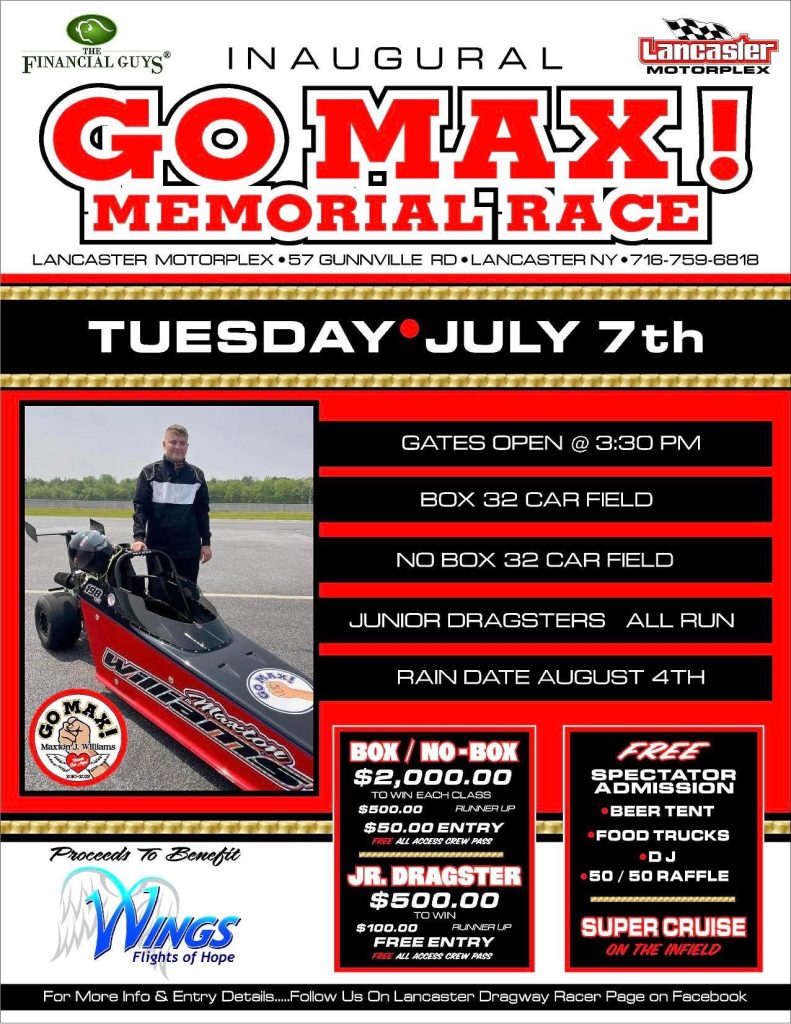 We are honored to be the beneficiary of the Inaugural Go Max! Memorial Race at Lancaster Motorplex on Tuesday, July 7th.